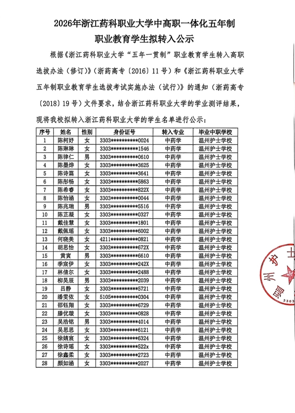 2026年浙江药科职业大学中高职一体化五年制职业教育学生拟转入公示